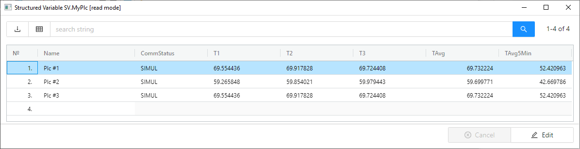 Následne vytvoríme štruktúrovanú premennú SV.MyPlc s typom štruktúry SD.MyPlc. Tá môže mať ľubovolný počet riadkov. Do prvých troch riadkov pripojíme objekty z komunikácie - merané body s teplotami a stavy jednotlivých staníc.
