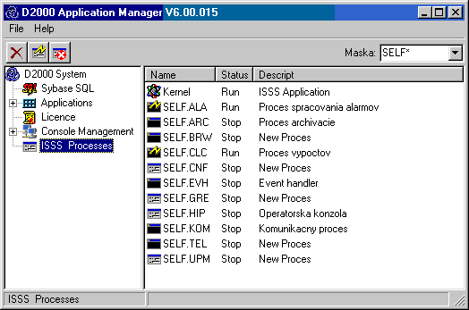 Po vybratí položky <meno_aplikácie> Processes bude v pravej časti okna zobrazený zoznam procesov aktuálne spustenej aplikácie. Na zoznam je možné aplikovať masku umiestnenú v pravej hornej časti okna.