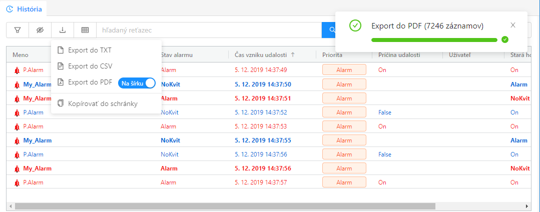 Exportovanie všetkých záznamov do PDF cez dropdown menu tlačidla export. Vpravo hore sa zobrazuje progres celého exportu na konci ktoré sa zobrazí štandardný dialóg na uloženie súboru.