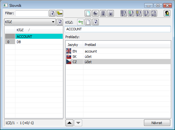 Obsah závisí od filtra - zobrazenie kľúčov alebo jazykových verzií.