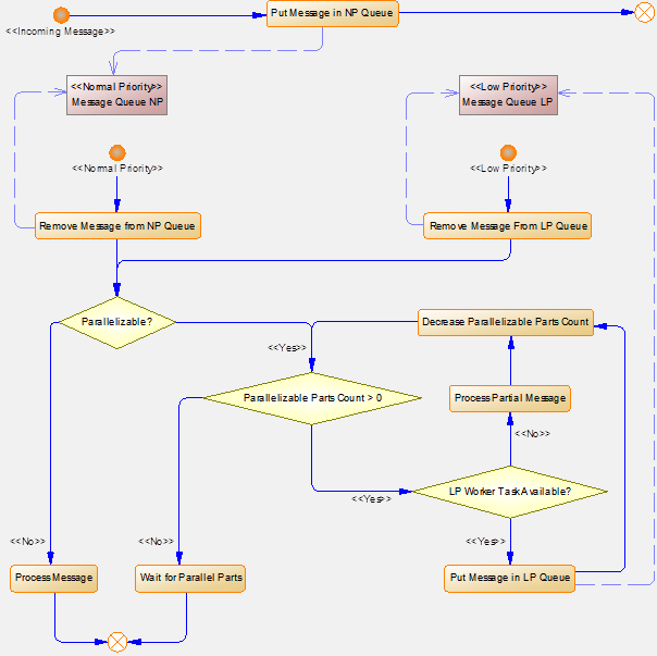Každý typ spracovateľského vlákna má pridelenú vlastnú frontu správ, z ktorej správy vyberá. Rozklad paralelizovateľných požiadaviek je implementovaný tak, aby nedochádzalo k zbytočnému čakaniu na spracovanie vo fronte.