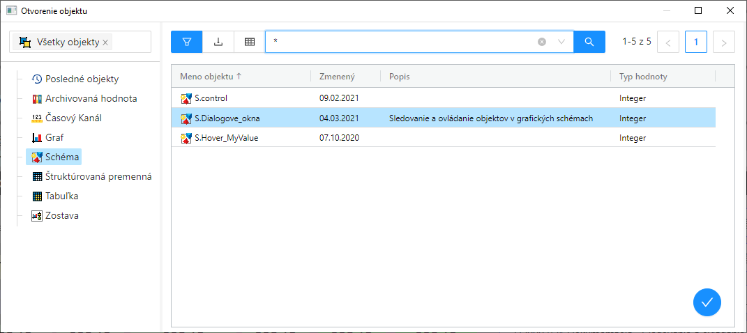 Hľadanie konkrétnej schémy v zozname je možné pomocou masky alebo zapnutím filtra tlačidlom . Pri použití filtra sa maska zablokuje, pričom text v nej zadaný sa nevymaže. Hľadanie sa spustí stlačením klávesy ENTER alebo tlačidlom .