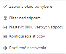 Tlačidlo rozšírené možnosti tabuľky ponúka nasledovné možnosti nastavení :