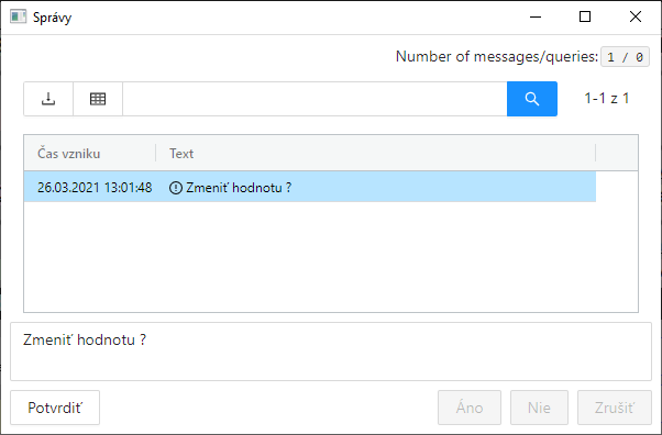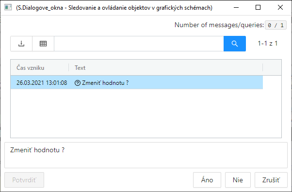 Pri niektorých činnostiach, vyžadujúcich si potvrdenie, sa v procese D2000 HI zobrazuje okno pre správy a otázky.