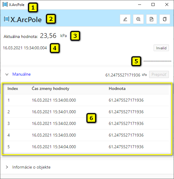 | 3 | Aktuálna hodnota a technické jednotky objektu. |