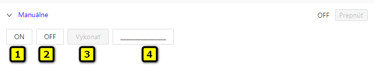 Sekcia umožňuje manuálne nastavenie hodnoty výstupného objektu spolu s užívateľskými príznakmi. Obsahuje tlačidlo Prepnúť, aktuálnu hodnotu objektu a čas priradenia hodnoty objektu. Po stlačení tlačidla Prepnúť sa otvorí dialógové okno na potvrdenie prechodu objektu do stavu Manuálna hodnota. Po stlačení tlačidiel Áno a Vykonať má sekcia nasledovný vzhľad: