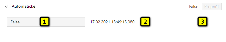 Sekcia umožňuje automatické nastavenie hodnoty výstupného objektu spolu s užívateľskými príznakmi podľa riadiaceho objektu. Obsahuje tlačidlo Prepnúť , aktuálnu hodnotu objektu a čas priradenia hodnoty objektu. Po stlačení tlačidla Prepnúť sa otvorí dialógové okno na potvrdenie prechodu objektu do stavu Automatické ovládanie. Výstupný objekt bude nadobúdať hodnotu a užívateľské príznaky riadiaceho objektu.
