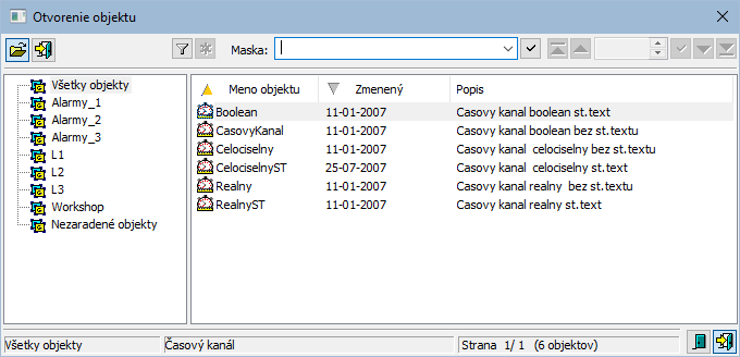 Hľadanie konkrétneho časového kanála v zozname je možné pomocou masky alebo zapnutím filtra tlačidlom Tlačidlo filter. Pri použití filtra sa maska zablokuje, pričom text v nej zadaný sa nevymaže. Hľadanie sa spustí stlačením klávesa ENTER alebo tlačidlom .