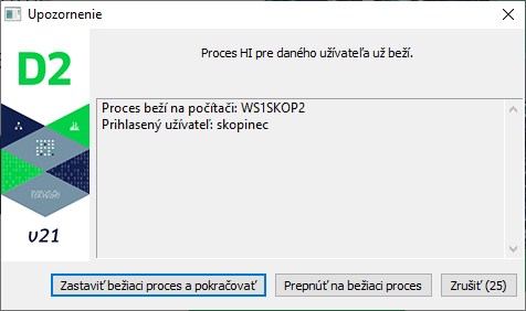 Poznámka: Ak štartovaný proces HI s rovnakým menom už beží na inom počítači, zobrazí sa správa, ktorá informuje užívateľa o už bežiacom procese HI, na ktorom počítači beží a meno prihláseného používateľa. Užívateľ môže zastaviť tento proces kliknutím na tlačidlo Zastaviť bežiaci proces a pokračovať.