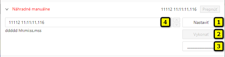 Záložka umožňuje manuálne nastaviť náhradnú hodnotu objektu spolu s užívateľskými príznakmi. Obsahuje tlačidlo Prepnúť, aktuálnu hodnotu objektu a čas priradenia hodnoty objektu. Po stlačení tlačidla Prepnúť sa otvorí dialógové okno na potvrdenie prechodu objektu do stavu Náhradná hodnota. Po stlačení tlačidla Áno a Vykonať  má sekcia Náhradné manuálne nasledovný vzhľad: