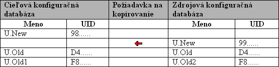 Tabuľky znázorňujú konfiguračné databázy pred a po kopírovaní objektu U.New. V priebehu kopírovania mu bolo potrebné zmeniť meno. Platný objekt je U.New_ZMENA.