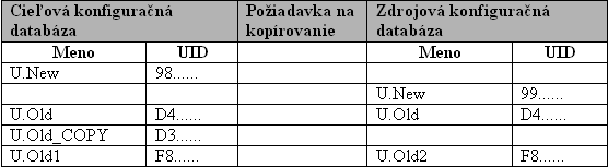 Tabuľky znázorňujú konfiguračné databázy pred a po kopírovaní objektu U.Old ako zálohy. Pôvodný