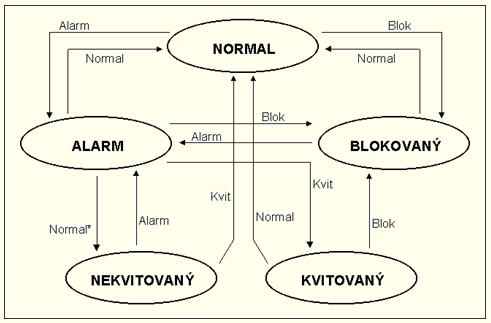 Stavový diagram systémových alarmov znázorňuje všetky prípustné stavy objektov typu