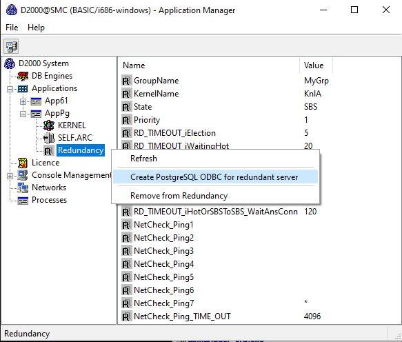 Poznámka: na vytvorenie DSN konfiguračnej databázy vzdialeného servera sa pre PostgreSQL dá použiť nástroj D2SMC. V kontextovom menu na položke Redundancia (Redundancy) treba vybrať "Create PostgreSQL ODBC for redundant server".