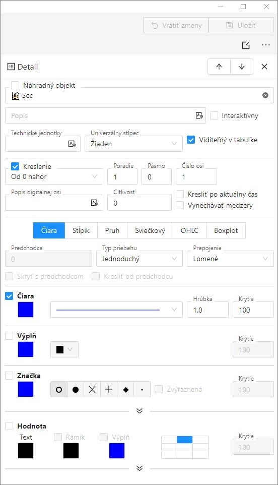 Dialógové okno slúži na konfiguráciu jednotlivých priebehov v grafe. Každý objekt má vlastné okno Detail pre nastavenie parametrov. Poradie objektov, pre ktoré je okno Detail zobrazované sa mení pomocou tlačidiel .