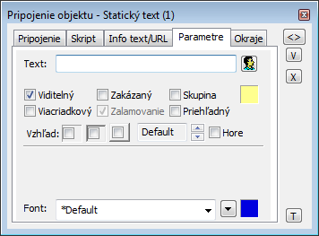 Konfigurácia parametrov statického textu prebieha v paletke Pripojenie objektu prostredníctvom nasledujúcich záložiek:
