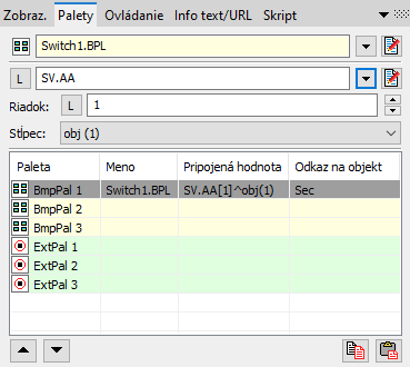 Bitmapová paleta (1) sa priradí danému grafickému objektu prostredníctvom paletky Pripojenie objektu v záložke Palety.