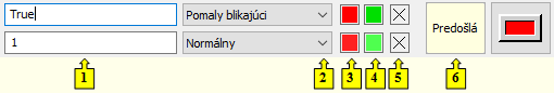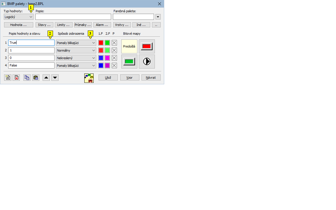 Pre každý riadok bitmapovej palety je možné definovať nasledovné parametre (1 až 6):