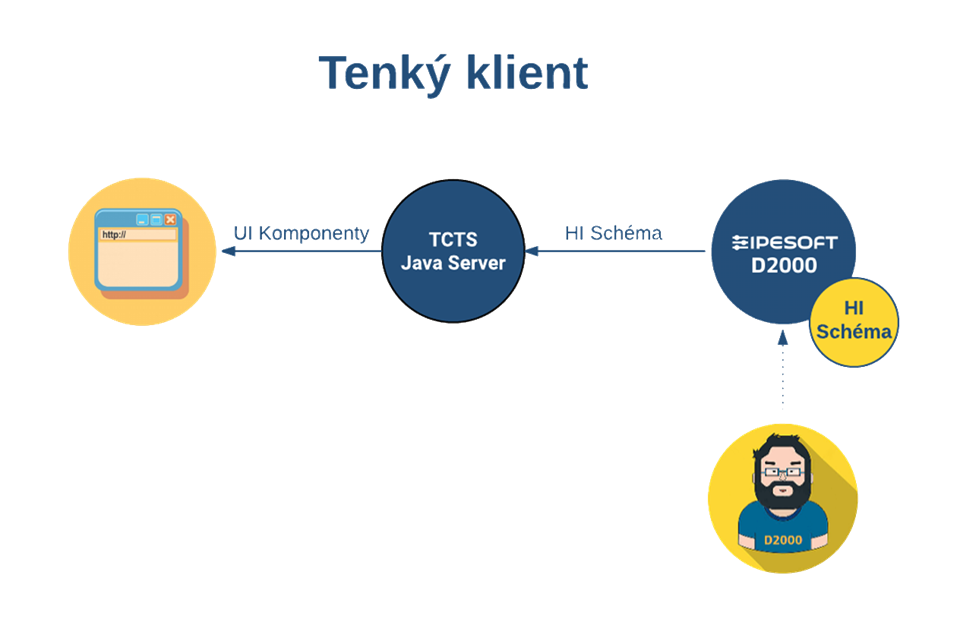 Tenký klient bol prvým uceleným riešením, ktoré vyplynulo automaticky z existujúceho stavu v spoločnosti, ktorá má dostatok skúsených vývojárov na platforme D2000. Koncept Tenkého Klienta spočíva v presnom zobrazení HI Schémy v prehliadači, teda tvorcom webovej aplikácie je samotný programátor HI schémy. Výhoda tohto riešenia spočíva predovšetkým v tom, že D2000 programátor nemusí ovládať webové technológie, postačí znalosť D2000 a o zvyšok sa postará server Tenkého Klienta (TCTS). Hlavná nevýhoda tohto riešenia vyplýva z faktu, že svet desktopových aplikácii (HI Schéma) je úplne rozdielny od sveta webových aplikácii. A preto HI schéma zobrazovaná v prehliadači sa nebude nikdy správať a vypadať ako natívna webová aplikácia (napr. už len z pohľadu pozicionovania a štýlovania komponentov, využitia API prehliadača, atď.). V situáciách kedy toto obmedzenie nie je dôležité, má ale nasadenie Tenkého Klienta svoje opodstatnenie.