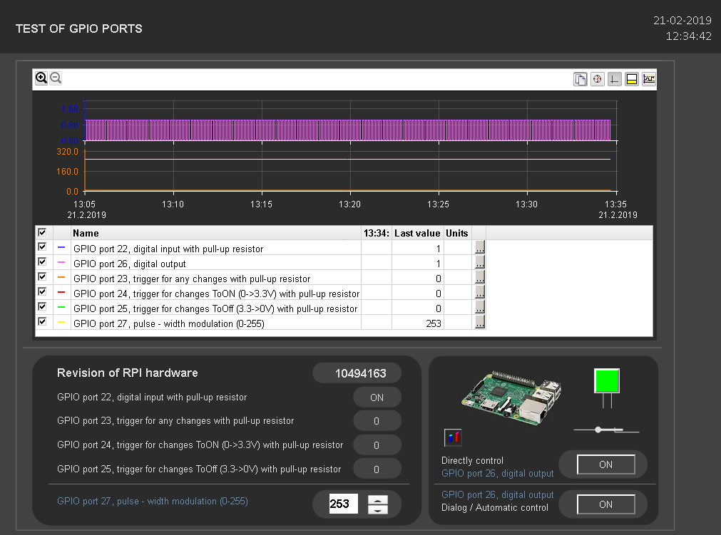 Prechod do medzi manuálnym a automatickým ovládaním je možný cez riadiaci dialóg, ktorý sa otvorí po kliknutí na horné tlačidlo z dvoch identických označených "GPIO port 26".
