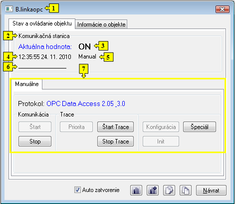 Ak bol ku grafickému objektu pripojený na ovládanie objekt typu Stanica a prihlásený užívateľ má dostatočné prístupové práva, potom kliknutím myši na daný grafický objekt sa zobrazí ovládacie okno, ktoré pozostáva z 2 častí (záložiek):