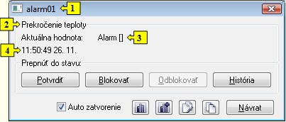 Ak bol ku grafickému objektu pripojený objekt typu Alarm (systémový alarm) a prihlásený užívateľ má dostatočné prístupové práva, potom kliknutím myši na daný objekt sa zobrazí nasledujúce ovládacie okno.
