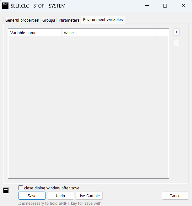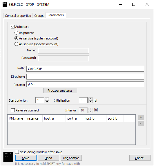 Start parameters of the process. The list of parameters is opened after clicking the button Proc. parameters.