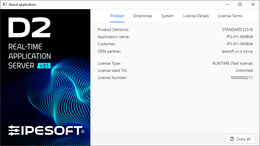 Produkt - Containing basic information about the product and the license