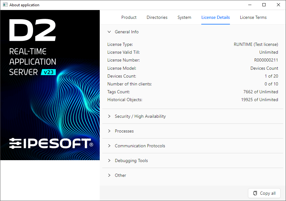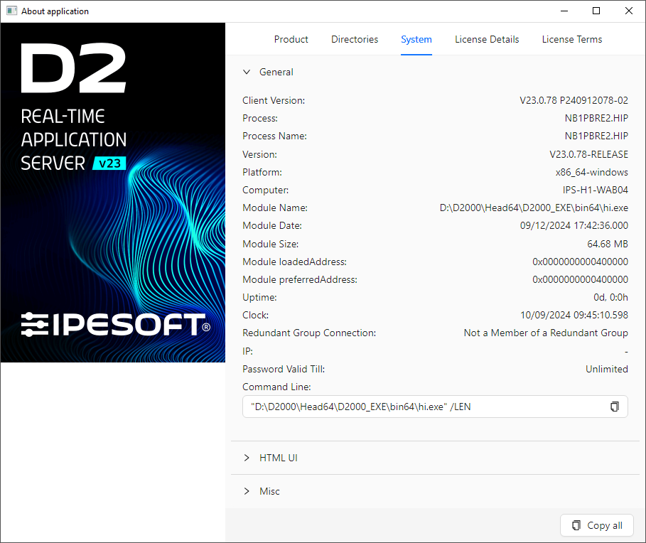 After selecting the About D2000 HI... item in the v D2000 HI menu Help a dialog box opens containing the following items: