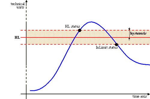 The object value is in the status InLimit. This value exceeds the limit HL (we assume that the object value will not exceed the level HL+HYSTERESIS - it is within the red-colored area in the figure). The value status is still InLimit. The system assigns the value status HL to the object as soon as the value exceeds the level HL+HYSTERESIS (the value is above the red-colored area in the figure). This is also valid when the value is decreasing. The value gets the status InLimit as soon as it falls bellow the level HL-HYSTERESIS (the value is below the red-colored area in the figure).