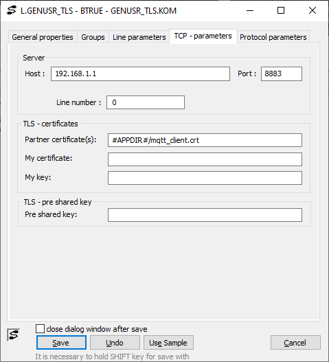 Note 2: The private key can be protected by password encryption. In this case, enter the password for the key in the "Pre shared key" item in the "TLS pre shared key" section.