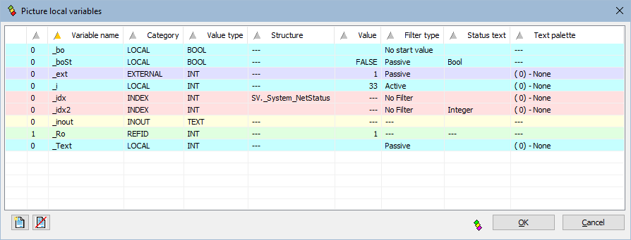 First columnThe column is used to select given local variable in the list. Double-click on the column corresponds to clicking the button OK in the dialog window. After inserting graphic objects from clipboard into picture, the column shows symbols for added local variable or name or definition conflict.