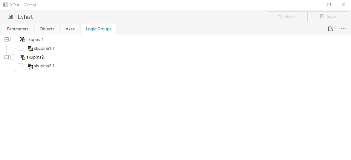 Groups tab allows to define groups, to which the graph will be assigned (checked with the blue symbol). Select a group and click on the control buttons to assign (unassign) to (from) selected group.